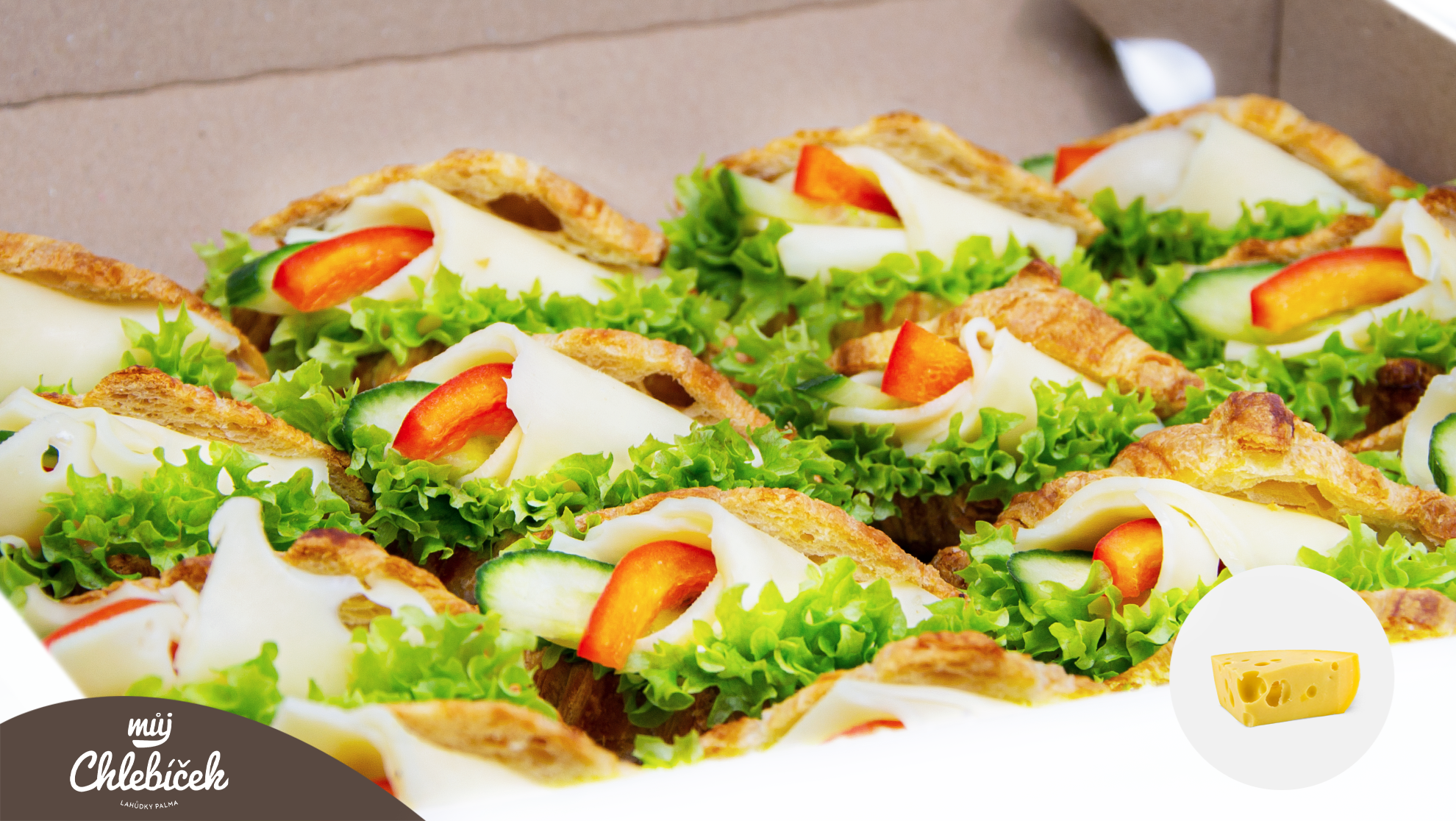 croissant máslový 50 % [mouka (PŠENICE, sladová PŠENICE, PŠENIČNÉ klíčky), máslo 23,5 % (MLÉKO), voda, cukr, droždí, PŠENIČNÝ lepek, sůl, MLÉKO, VAJEČNÝ žloutek, acerola extrakt, matlodextrin, barvivo (beta-karoten), enzymy], sýr ementálského typu 17% (MLÉKO, jedlá sůl, mlékařské kultury, barvivo (E160b)), [pomazánkový krém [zakysaná SMETANA, rostlinný tuk (palmový, kokosový, palmojádrový v různém poměru, aroma), sušené MLÉKO, bramborový škrob, jedlá sůl], okurka, paprika, salát.
