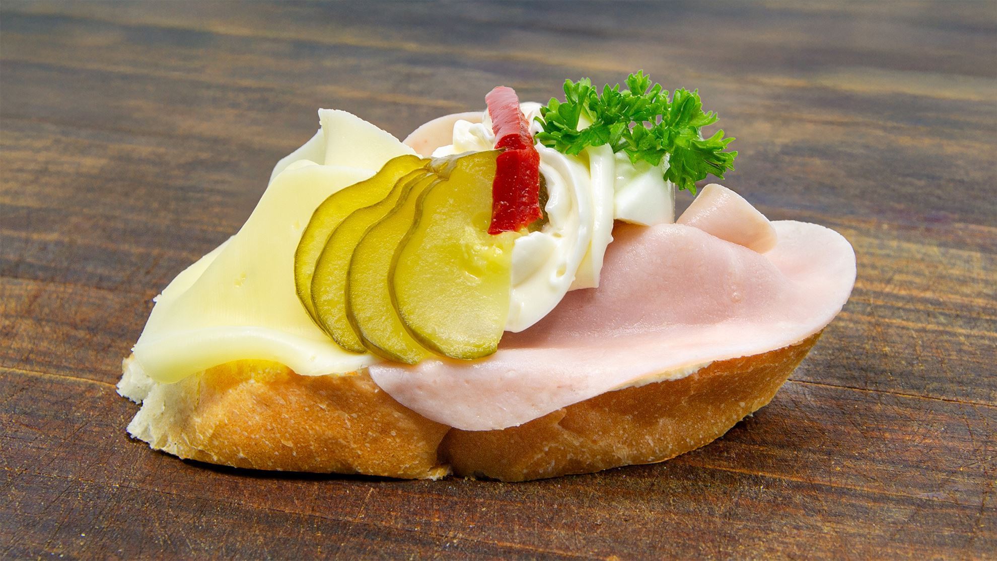bramborový salát 35 % {brambory vařené, majonéza [řepkový olej, voda, modifikované škroby, VAJEČNÝ žloutek sušený, stabilizátory (guma guar, xanthan), ocet kvasný lihový, cukr, sůl], sterilovaná zelenina (okurky, mrkev, CELER, hrášek), cibule, HOŘČIČNÉ semeno, cukr, ocet kvasný lihový, sůl, regulátor kyselosti (citronany sodné), konzervant (sorban draselný), pepř mletý}, veka {PŠENIČNÁ mouka, droždí, jedlá sůl, voda, rostlinný tuk ztužený [palmový tuk, řepkový olej, emulgátory (E471, slunečnicový lecitin), kyselina sorbová, kyselina citronová], pekařský přípravek [PŠENIČNÁ mouka, emulgátory (E471, E472e, E170), pšeničná sladová mouka, premix pekařských enzymů, látka zlepšující mouku (E300)]}, šunka standart 14 % [vepřová kýta, voda, sůl, konzervant (dusitan sodný), stabilizátory (di a trifosforečnany), zahušťovadla (E407a, E415), cukr, antioxidant (E316, E301)], sýr eidam 12 % (MLÉKO), VEJCE vařené, sterilovaná okurka, sterilovaná kapie, majonéza (řepkový olej, voda, VAJEČNÝ ŽLOUTEK sušený, ocet kvasný lihový, cukr, sůl), petržel.