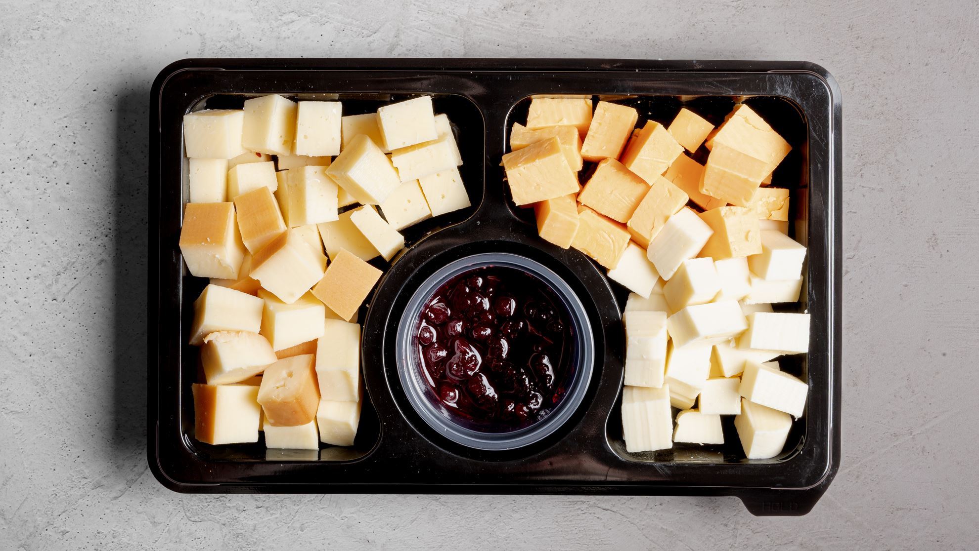 Složení: Mix sýrů 90,8 % [cheddar 22,7 % (MLÉKO, sůl, mlékárenské kultury, barvivo betakaroten), mozzarella 22,7 % (MLÉKO, sůl, mlékárenské kultury, regulátor kyselosti kyselina citronová), eidam 22,7 % (MLÉKO, sůl, mlékárenské kultury), uzený eidam 22,7 % (MLÉKO, sůl, mlékárenské kultury)], brusinky (lesní brusinky, cukr, voda, želírující látka pektin, regulátor kyselosti kyselina citronová), koření.